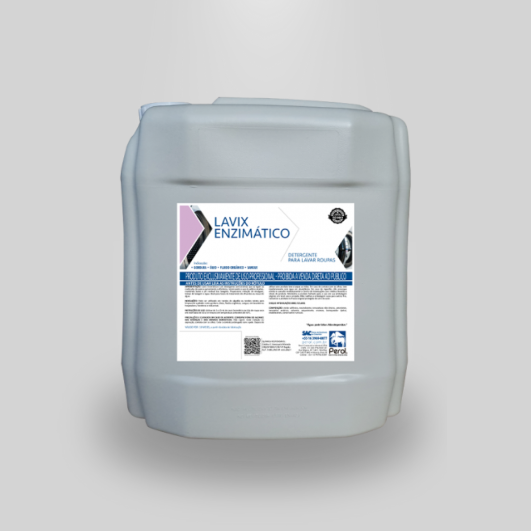 OBSERVAÇÃO: Utilizar de 3 a 10 mL de Lavix Enzimático por kilo de roupa seca em nível baixo de 10 a 20 minutos em temperatura ambiente até 50°C. As dosagens indicadas podem sofrer alterações dependendo das sujidades das roupas e tipos de processos.