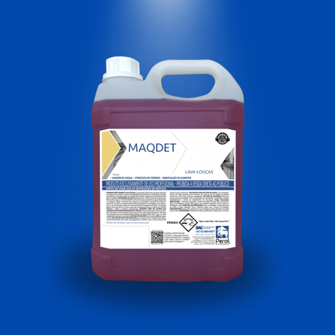 DESCRIÇÃO: MAQDET LAVA LOUÇAS é um produto alcalino de baixa espumação para lavagem de louças e utensílios em máquinas profissionais. Pode ser utilizado em limpeza CIP em indústria alimentícia.